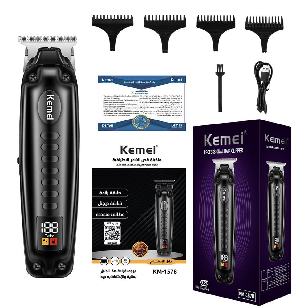 ماكينة قص الشعر الاحترافية Kemei KM-1578 هي الحل المثالي للحصول على قصة شعر دقيقة ومميزة في المنزل. تتميز بتصميم عصري ومريح مع شاشة رقمية لعرض مستوى البطارية.